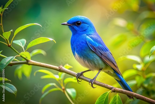 A solitary blue bird perches on a delicate branch, its vibrant feathers glistening in the soft light, surrounded by lush green leaves and gentle twigs.