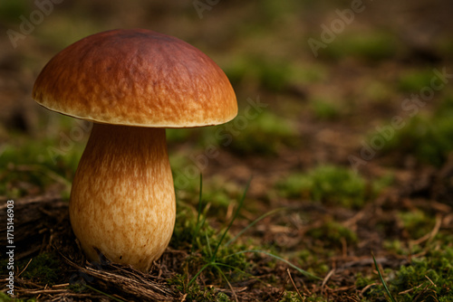 A solitary bolete mushroom stands tall amidst moss and forest debris, illuminated by soft natural light. Its smooth brown cap and thick, textured stalk create a striking contrast with the earthy green