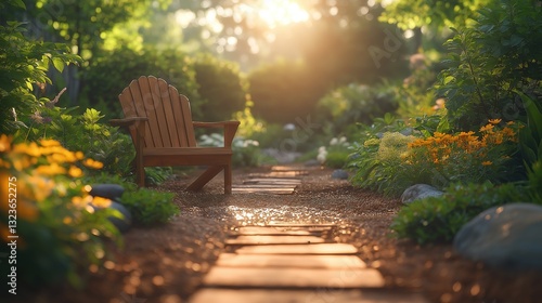 A solitary chair basks in soft sunlight, surrounded by lush greenery, evoking tranquility and quiet reflection