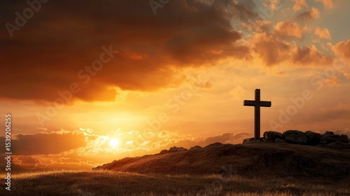 A solitary cross stands on a hilltop as the sun sets, casting warm orange and golden hues across the sky. Clouds drift by, enhancing the tranquil atmosphere of the moment