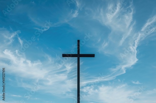 A solitary dark cross rises against a bright sky scattered with light clouds, representing belief and devotion.