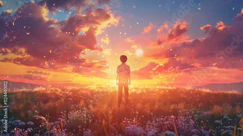 A Solitary Figure at Sunset: A lone individual stands amidst a field of wildflowers, bathed in the ethereal glow of a breathtaking sunset. The sky ablaze with vibrant hues of orange, pink, and purple.