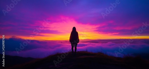 A solitary figure embraces the boundless sky during a vibrant sunset moment