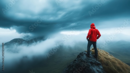 A solitary figure in a red jacket stands on a rocky ledge, gazing at a dramatic landscape filled with dark clouds and swirling mists, evoking a sense of adventure and contemplation.