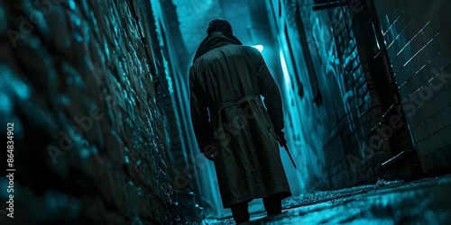 A solitary figure in a trench coat lingers in a dim alleyway. Concept Mystery, Suspense, Noir, Urban Setting, Alone
