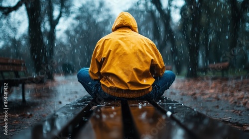 A solitary figure in a yellow jacket, seated cross-legged on a bench, braves the rainy weather, illustrating themes of calm endurance and quiet isolation.
