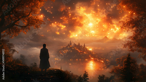 A solitary figure observes a distant, glowing cityscape set against a fiery, cloud-filled sky and autumnal foliage