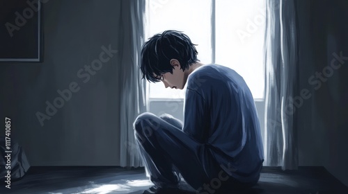 A solitary figure sits in a dimly lit room, reflecting on emotions and introspection.