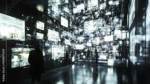A solitary figure standing in a room with a wall of screens displaying abstract patterns.