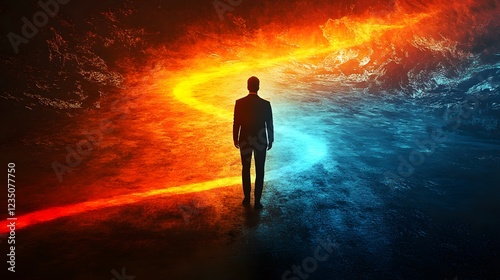 A solitary figure stands at the intersection of vibrant red and blue pathways, symbolizing a journey of choices, emotions, and self-discovery against a dramatic, cosmic backdrop.