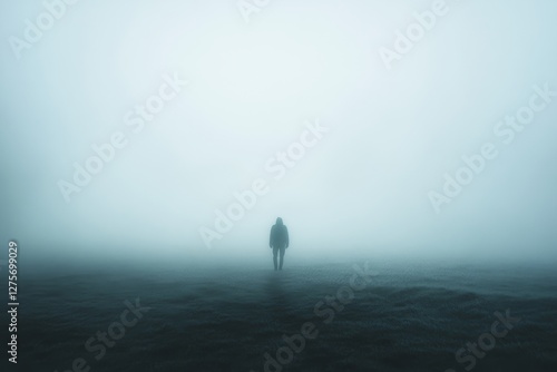 A solitary figure stands enveloped in thick fog, evoking a sense of mystery and introspection in a dreamlike, ethereal landscape.
