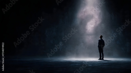 A solitary figure stands in a dramatic spotlight gazing at a large misty question mark on a dark textured wall
