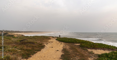 a solitary figure walking along a coastal path, with wildflowers in the foreground, overlooking a misty and tumultuous sea beside a sandy beach, offering a sense of solitude and contemplation