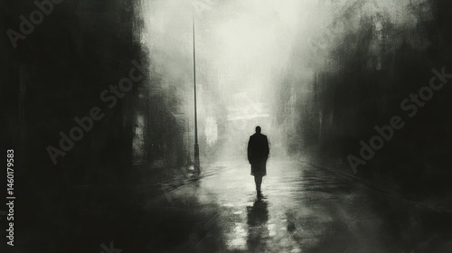 A solitary figure walks a shadowy urban pathway.