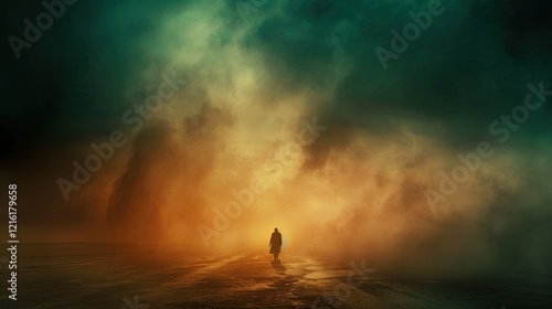 A solitary figure walks through a misty landscape, illuminated by warm, ethereal light.