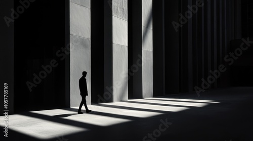 A solitary figure walks through a modern architectural space illuminated by shadows and light