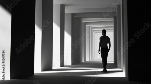 A solitary figure walks through an abstract corridor, illuminated by contrasting light and shadow in a minimalist environment.