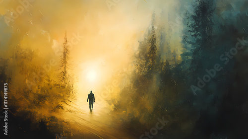 A solitary figure walks toward a radiant light emanating from the heavens, symbolizing hope, faith, and the pursuit of spiritual enlightenment. Ravenwood. Illustration