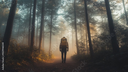 A solitary hiker navigates a misty forest trail at dawn, surrounded by tall trees and soft sunlight filtering through the fog, creating a peaceful and contemplative atmosphere.