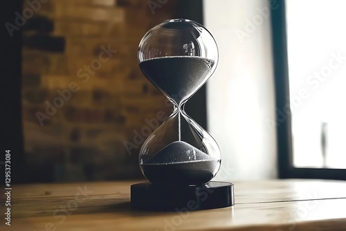 A solitary hourglass on a wooden table, symbolizes the passage of time and life's fleeting moments.