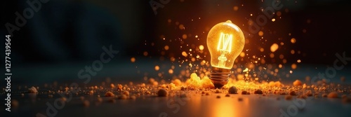 A solitary light bulb shatters on the floor in a flash of radiant light, explosion, flash, luminosity