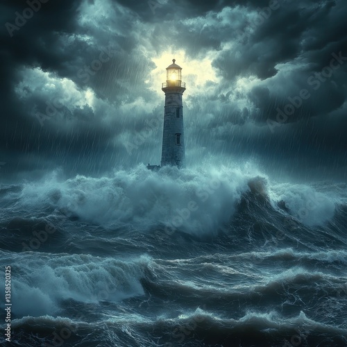 A solitary lighthouse stands amidst raging stormy seas under ominous clouds.