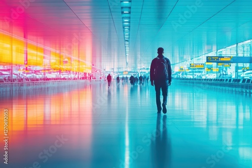 A solitary man strolling through a bustling airport terminal filled with travelers capturing the essence of movement and anticipation in modern travel