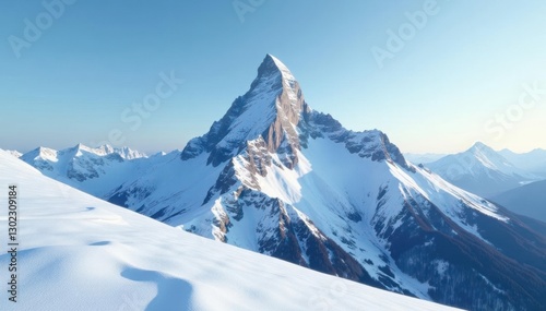 A solitary mountain peak rising above snowy peaks, serene solitude, frozen landscape, cold climate