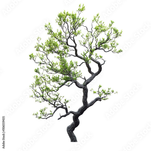 A solitary oak tree with sprawling branches, nature element, hyper-realistic 3D rendering, vibrant green leaves, isolated on white background.