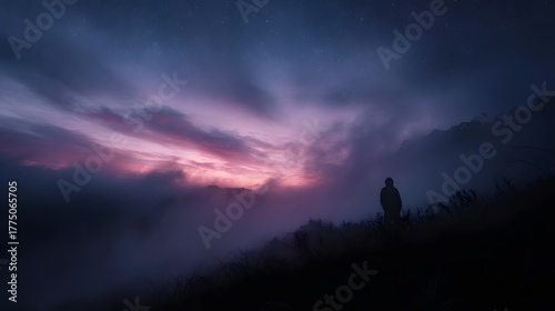 A solitary person stands on a misty hill at dawn gazing at the pastel colored sky filled with stars