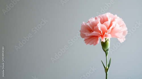 A solitary pink carnation in a soft grey background, side shot, Subtle style