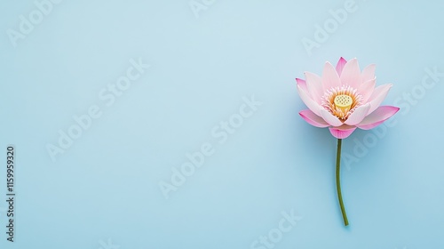 A solitary pink lotus flower in a serene light blue background, overhead shot, Peaceful style