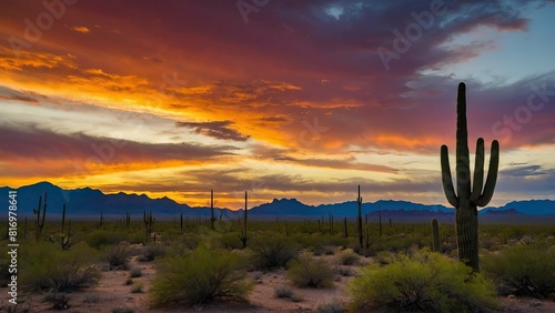 A solitary saguaro cactus stands tall against a desert sunset.