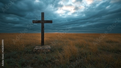 A solitary tombstone, adorned with a rustic wooden cross, situated in an expansive field beneath a cloudy sky, with gentle illumination filtering through.