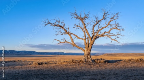 A solitary tree stands in a vast open rural landscape beneath the sky