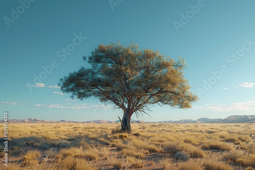 A solitary tree stands in the vast expanse of a desert, with sandy dunes stretching out to the horizon