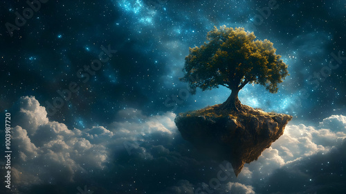 A solitary tree stands on a floating island amidst cosmic clouds and stars, symbolizing isolation and beauty in the universe.