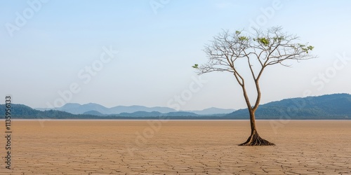 A solitary tree stands on dry, cracked earth, surrounded by distant hills under a clear sky, symbolizing resilience and survival in arid conditions.