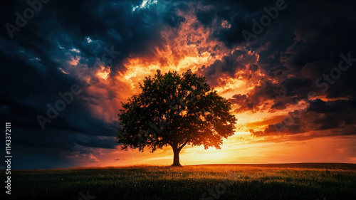 A solitary tree stands resilient in the vast desert, framed by a dramatic sky filled with swirling clouds and vibrant hues, capturing the stark beauty and isolation of this arid landscape.