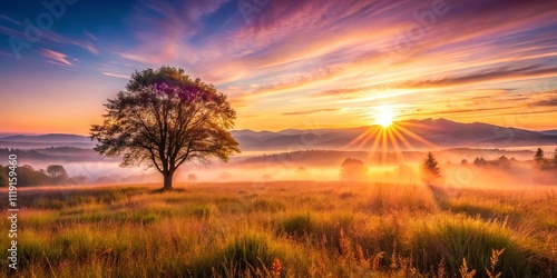 A solitary tree stands tall in a field bathed in the golden light of sunrise, with a mist rising from the valley below and mountains in the distance.