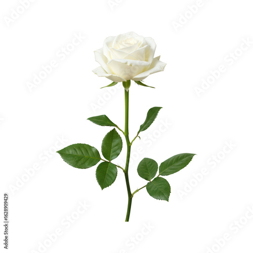 A solitary white rose stands tall with vibrant green leaves and a slender stem Isolated On White Background