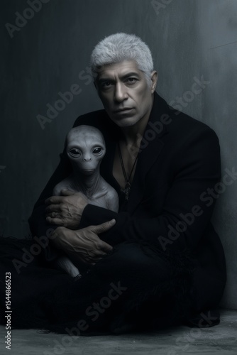 A somber man with gray hair embraces a small gray alien. The dim lighting creates a mysterious and dramatic mood, highlighting the unique bond between them.