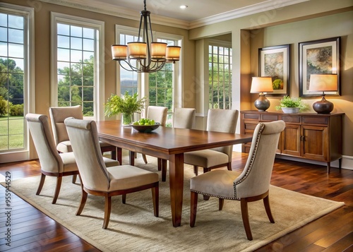 A sophisticated dining room with plush chairs and a robust wooden table from a renowned home furnishings retailer