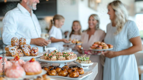 A sophisticated family reunion held in a luxurious venue, with elegantly dressed family members mingling and enjoying gourmet appetizers.