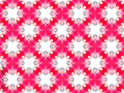 A sophisticated kaleidoscopic pattern in vibrant pink, red, grey and white colors. An elaborate fashion surface print for textile design, packaging, wrapping paper and stationery.