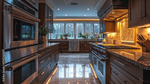 A sophisticated kitchen space featuring gleaming marble, subtle ambient lighting, and modern appliances