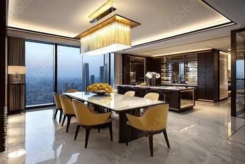 A sophisticated penthouse dining room furnished with upscale marble chairs.