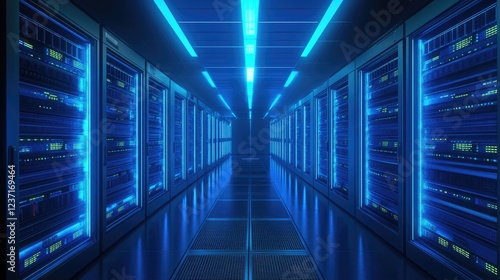 A sophisticated server room featuring glowing blue LED lights highlighting rows of advanced servers in a polished, high-tech environment. Perfect for illustrating IT operations, data storage