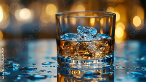 A sophisticated shot of a glass of whiskey on the rocks, showcasing the golden hues of the drink and the clarity of the ice cubes, set against a dark and warm background