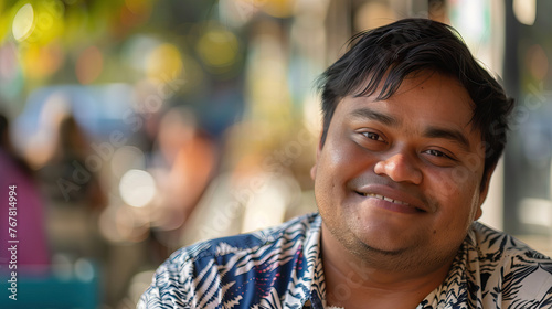 A South Asian man with Down syndrome smiling gently, radiating kindness and warmth. Learning Disability